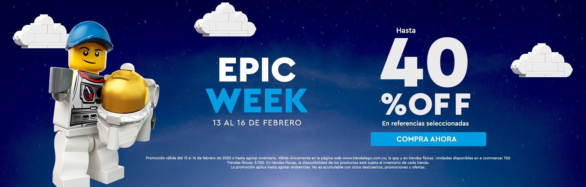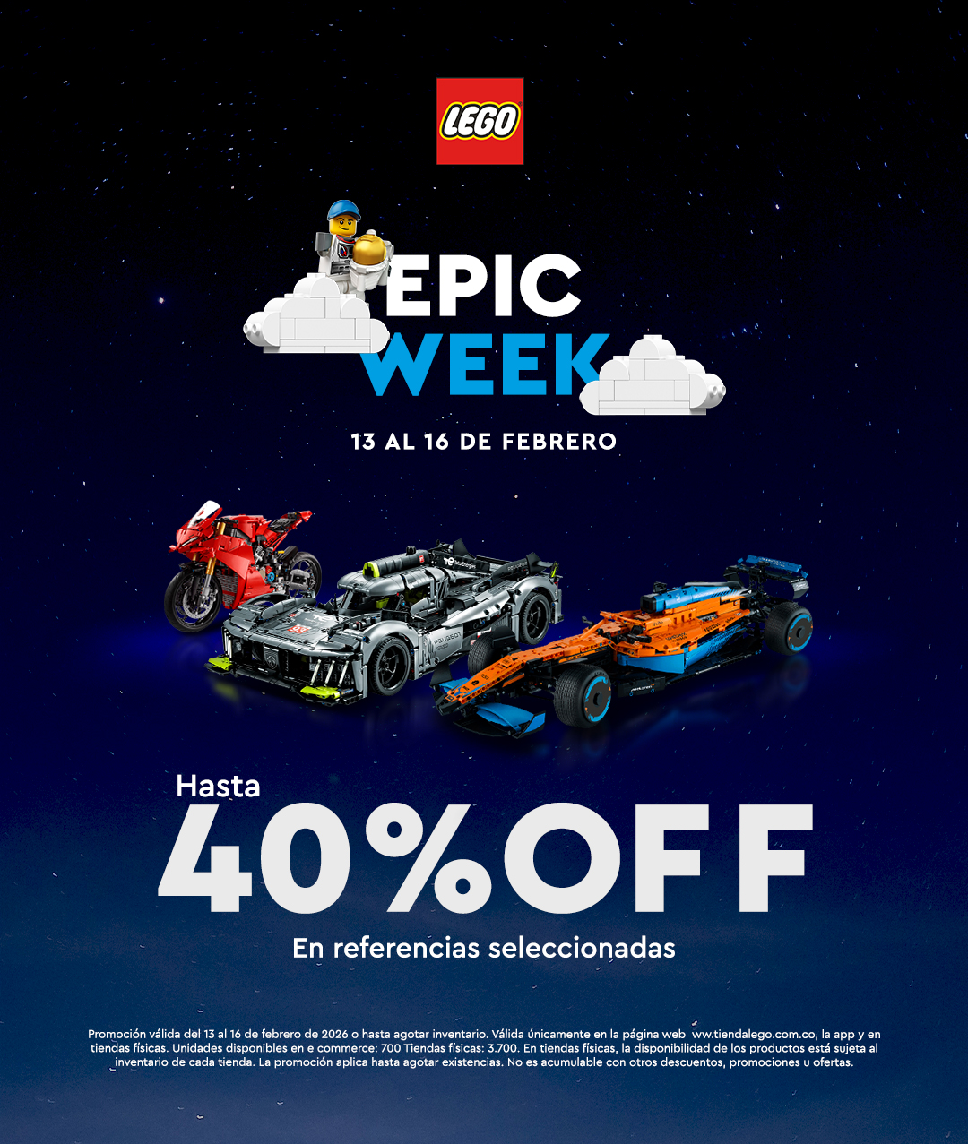 Promoción válida del 13 al 16 de febrero de 2026 o hasta agotar inventario. Válida únicamente en la página web www.tiendalego.com.co, App  Tienda LEGO® y en tiendas físicas.